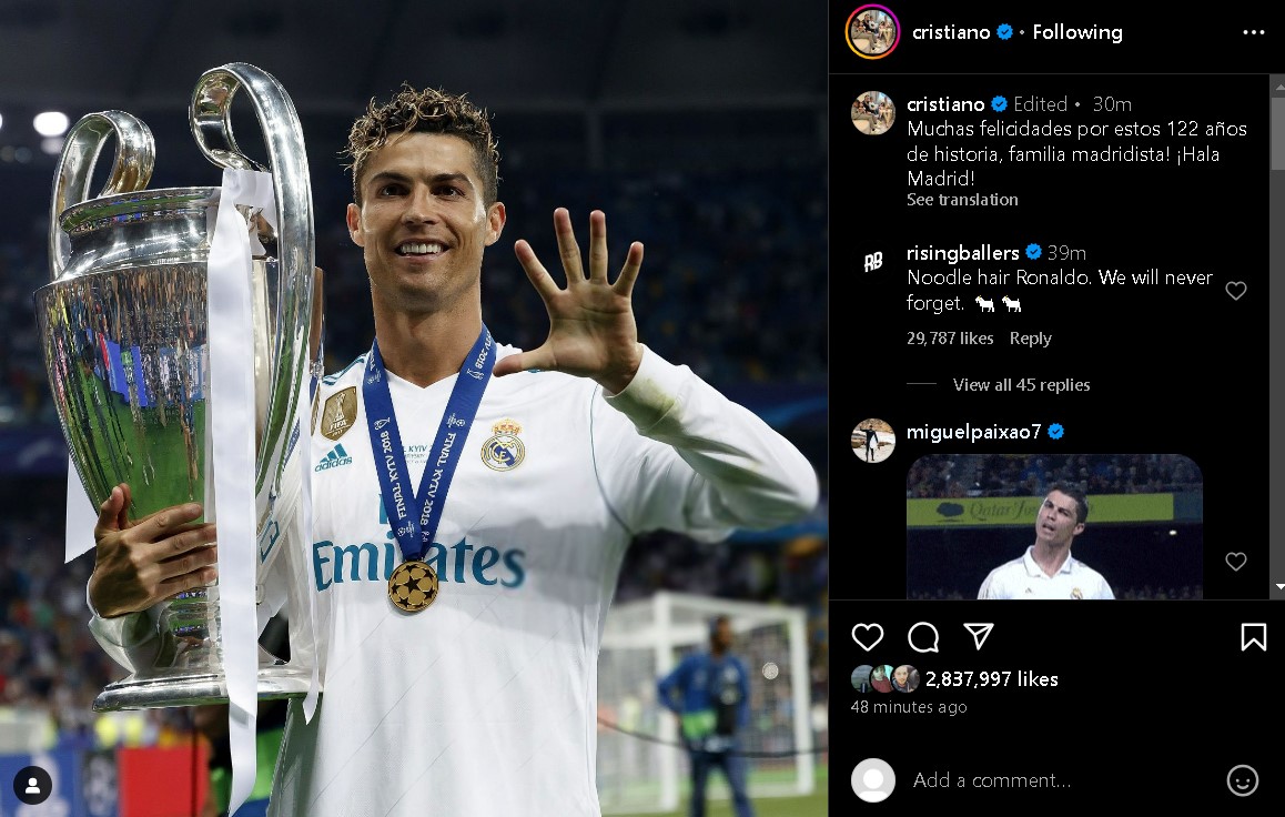 "გილოცავთ ამ 122-წლიან ისტორიას, მადრიდისტების ოჯახო. ჰალა მადრიდ!", - წერს კრიშტიანუ.