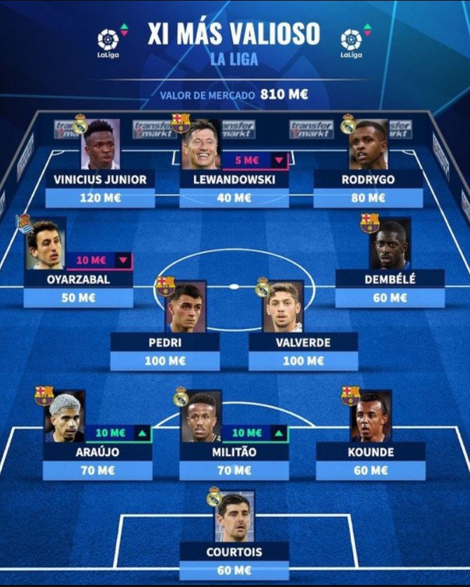 ყველაზე ძვირადღირებულ თერთმეტეულში ადგილს ტიბო კურტუა, ედერ მილიტაო, ფედე ვალვერდე, როდრიგო გოეში და ვინისიუს ჟუნიორი იკავებენ იკავებენ.