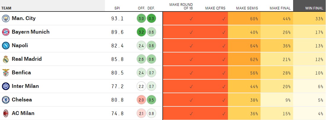 FiveThirtyEight-ის კომპიუტერულმა ალგორითმმა ლიგაზე შემორჩენილი გუნდების შანსები შეაფასა. როგორც ცნობილია, ტურნირის მოგების ყველაზე დიდი შანსი მიუნხენის "სიტის" აქვს (33%).